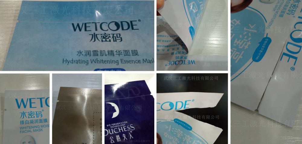 以下是三工激光根據(jù)不同品牌的面膜袋打樣的成品以及撕開(kāi)效果圖: